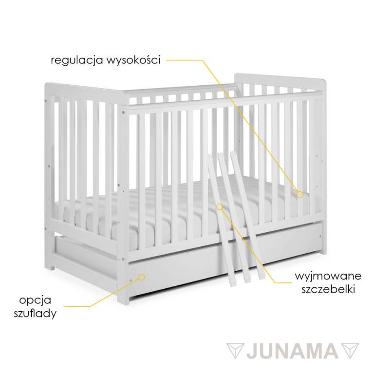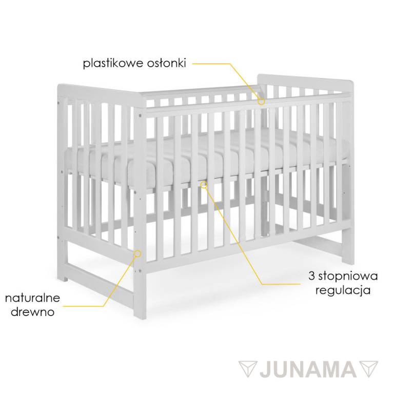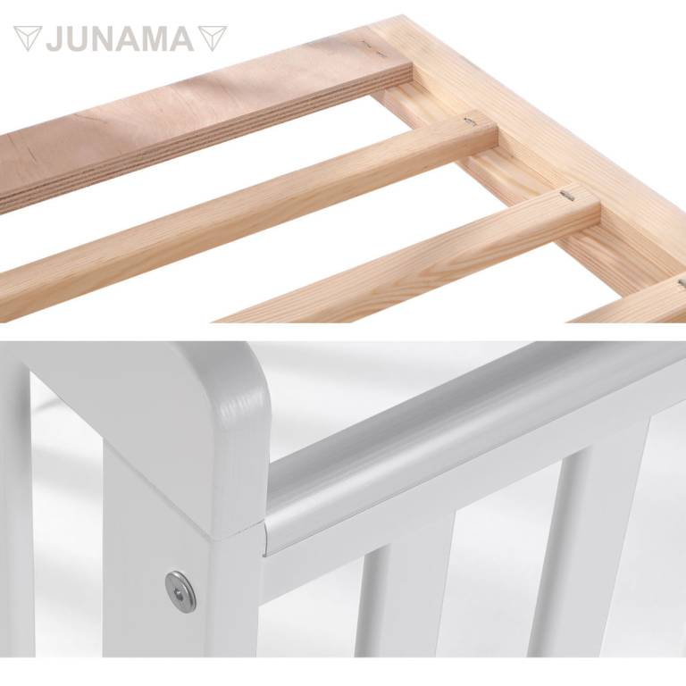 O Berço Branco Junama traz uma sensação de calma e pureza ao quarto do bebé. O seu acabamento branco nítido realça a beleza natural da madeira, criando uma peça central versátil que se integra harmoniosamente tanto em interiores modernos como tradicionais. Concebido com pormenores cuidadosos, este berço oferece um espaço seguro e adaptável para os primeiros anos do seu filho.