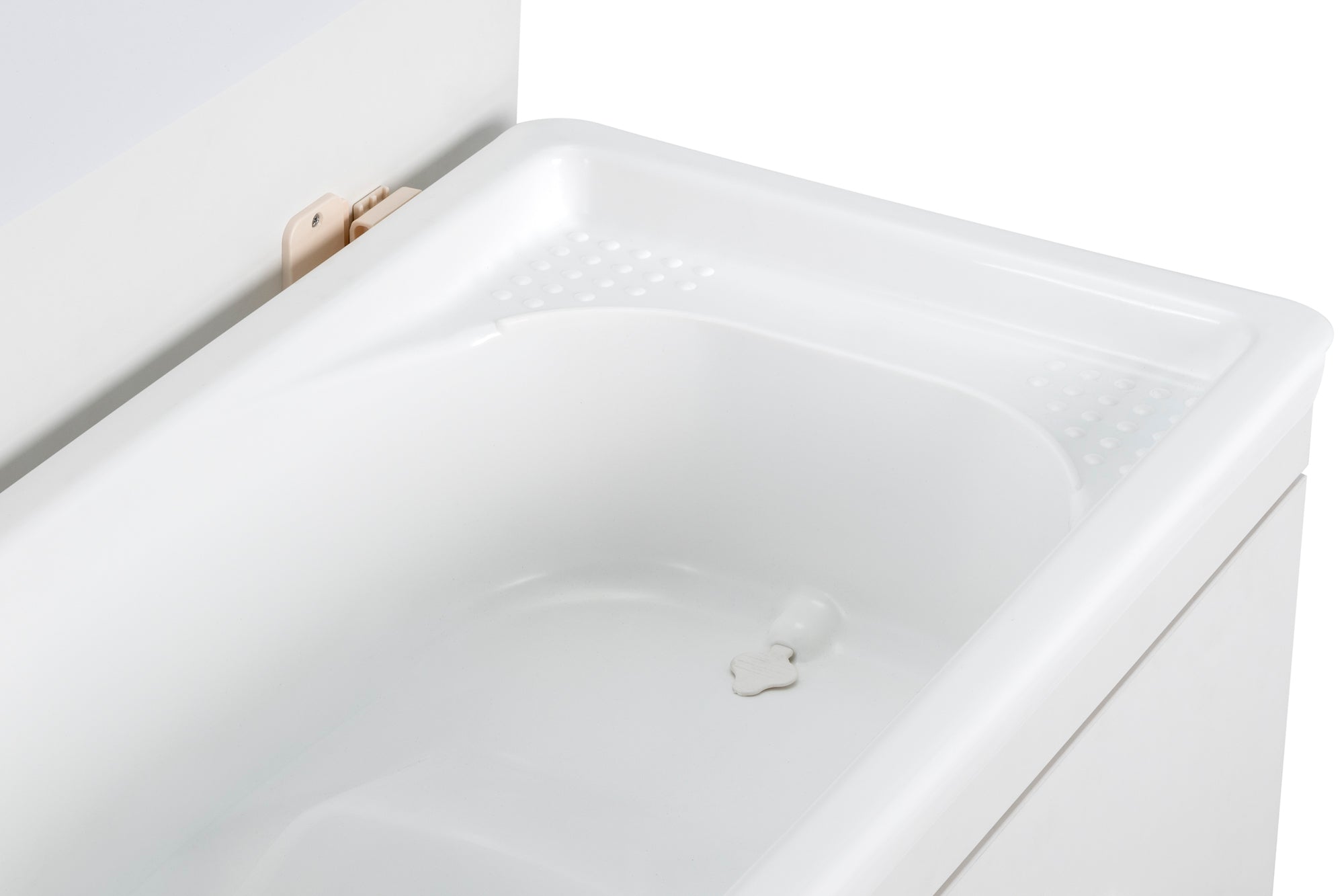 Designul atent include un suport pentru săpun și o cadă cu capac și țeavă de scurgere, asigurând o gestionare ușoară a apei și o curățare fără bătăi de cap. Cu o greutate de 47 kg, Comoda de baie Mare este solidă și robustă, concepută să susțină părinții în primii ani cu fiabilitate și ușurință.