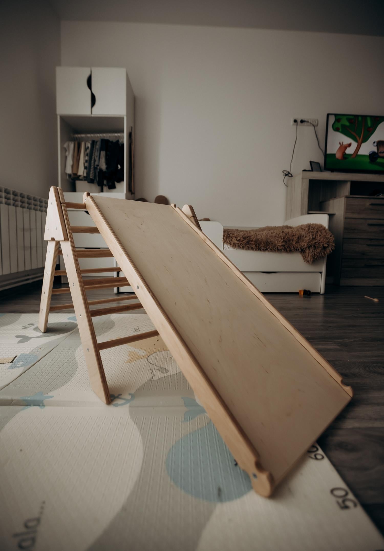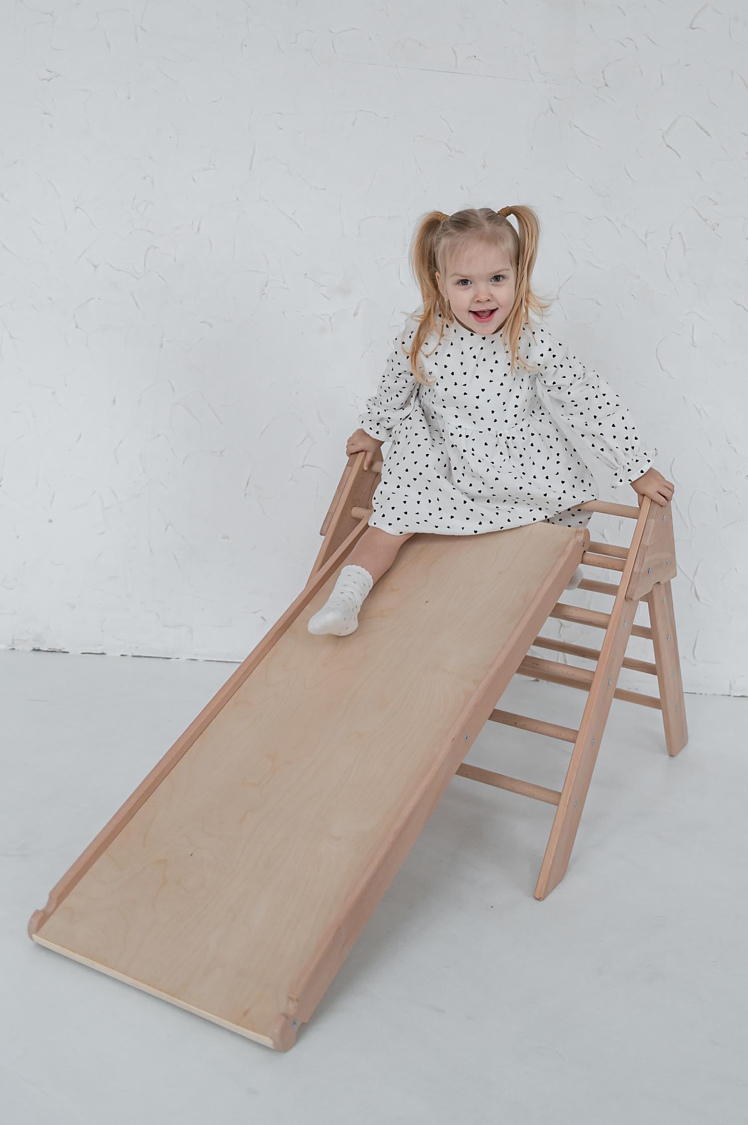 Vďaka kompaktným rozmerom trojuholníka 61 × 74 × 58 cm je rám ideálne prispôsobený batoľatám, zatiaľ čo posuvný/lezecký stolík (96 × 37 × 4 cm) pridáva variabilitu – mení sa z jemnej šmýkačky na lezeckú rampu s nekonečnými možnosťami hry. Sada prichádza v balení s rozmermi 101 × 42 × 6,5 cm a váži len 8,5 kg, čo uľahčuje presun, uskladnenie alebo darovanie.