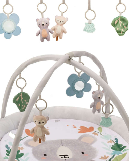 - Utvecklingsleksaker ingår: Kommer med två plyschleksaker, en bitleksak och en spegel för att väcka fantasi och motoriska färdigheter.